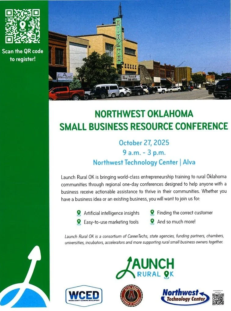 Back to All Events Northwest Oklahoma Small Business Resource Conference (Free Event) Monday, October 27, 2025 9:00 AM 3:00 PM Northwest Technology Center 1801 South 11th Street Alva, OK, 73717 United States (map) Google Calendar ICS