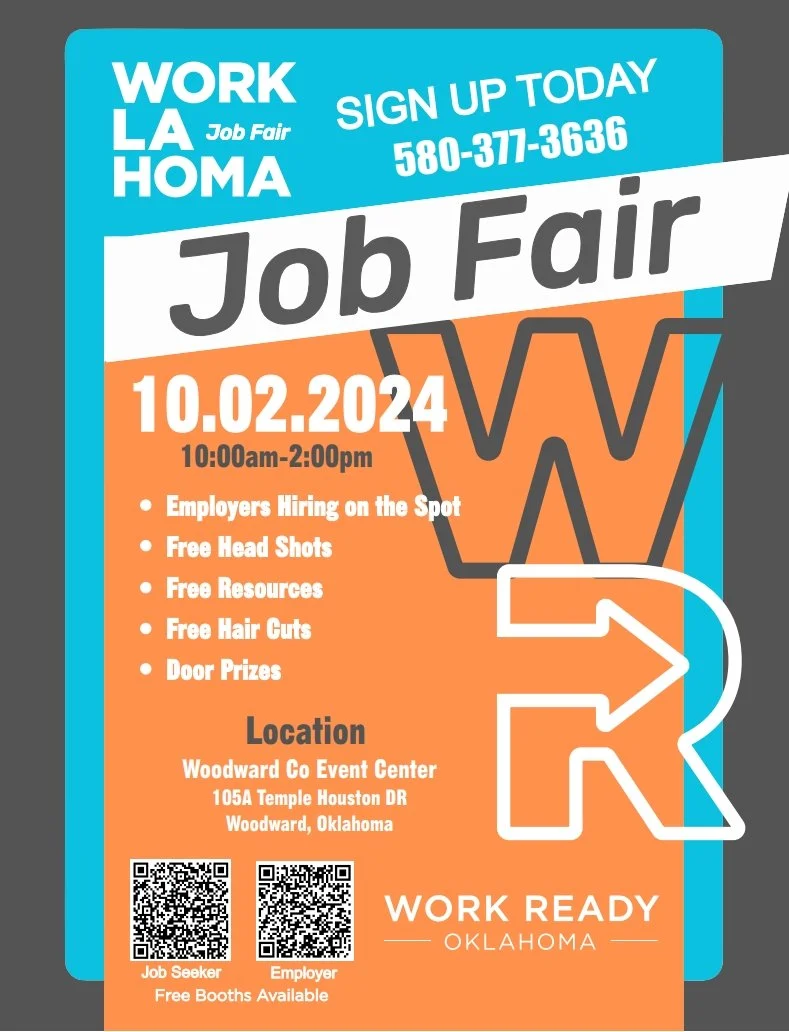 Worklahoma Job Fair Wednesday, October 2, 2024 10:00 AM 2:00 PM Woodward County Event Center & Fairgrounds 105A Temple Houston Drive Woodward, OK, 73801 United States (map) Google Calendar ICS